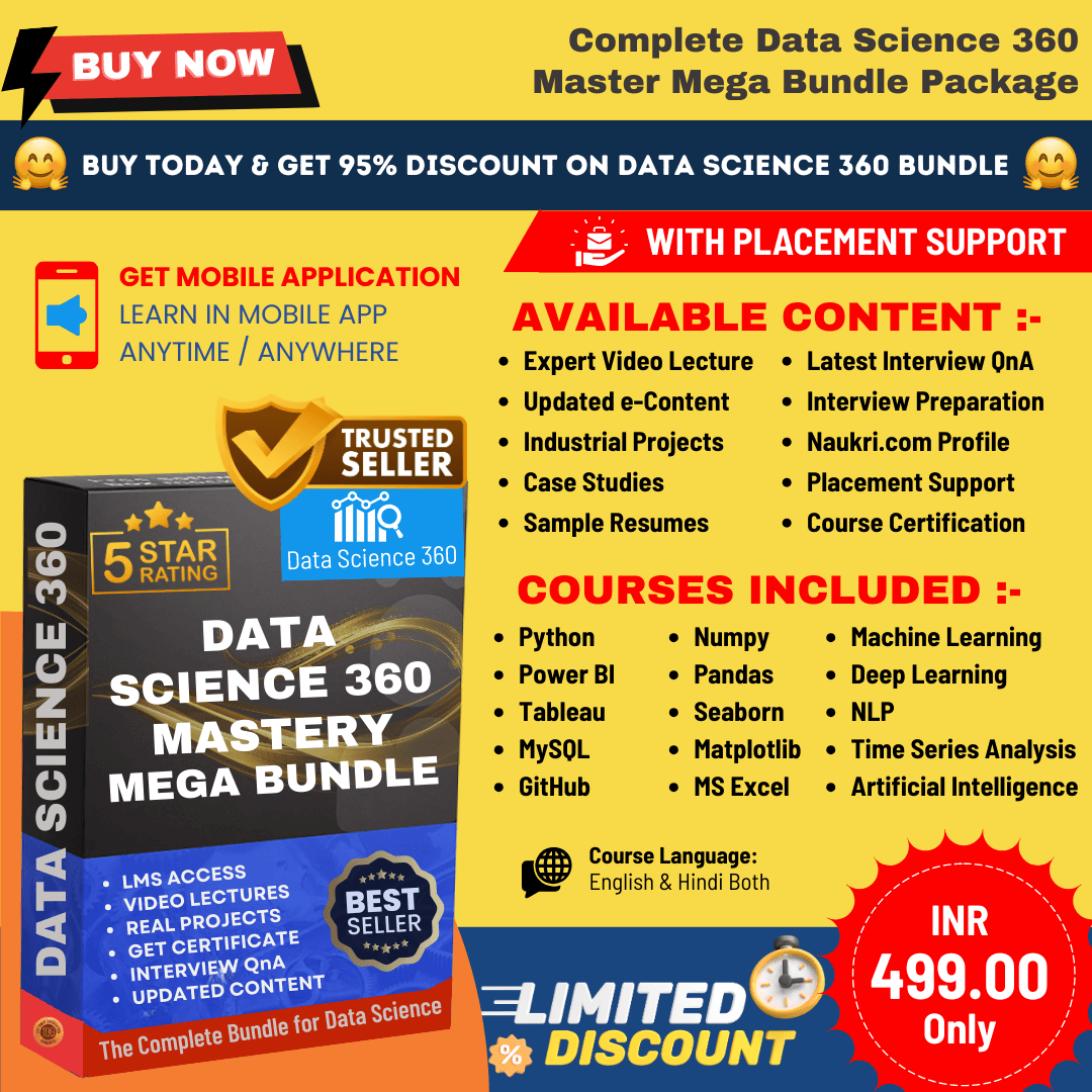 Master 12+ In-Demand Data Science & AI Tools (Python, ML, DL, Power BI, Tableau, SQL, Excel & more) in One All-in-One Data Science 360 Bundle with Expert Video Lectures, e-Content, 30+ Projects, Real Interview QnA’s, Resume Templates, and ISO Accredited Course Completion Certificate.