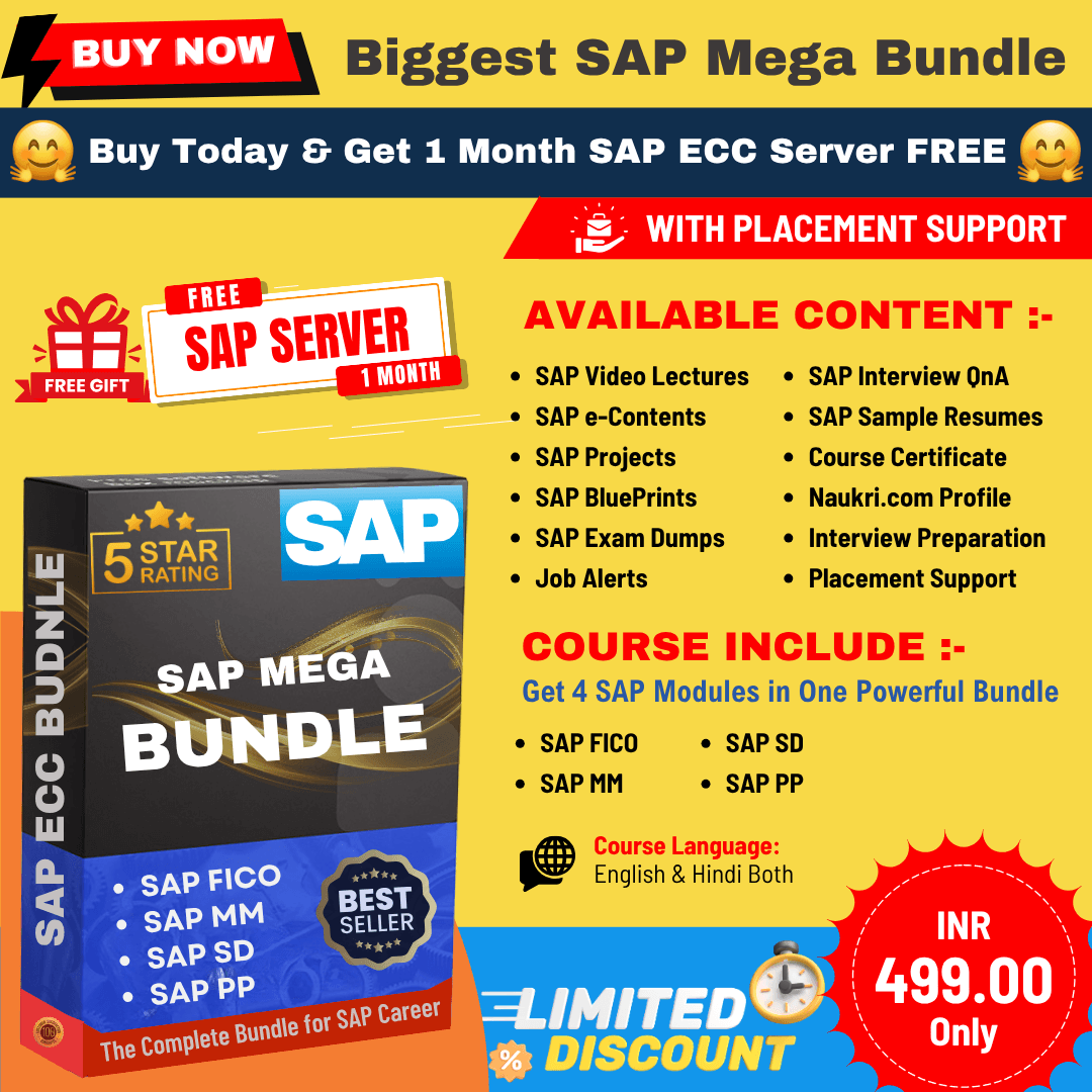 The SAP All-in-One Mega Bundle combines four powerful SAP modules—SAP FICO, SAP MM, SAP SD, and SAP PP—along with 1 month of free SAP Server access, we provide you with expert-led video lectures (Hindi & English), e-Content, projects, blueprint, ISO Accredited Course Completion Certificate, real MNC interview questions and answers, resume making sessions, resume sample & templates, session on naukri & linkedin profile creation, frequent job alerts and full placement support, all in a single package.